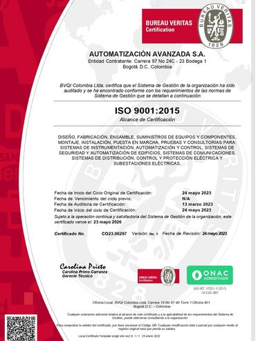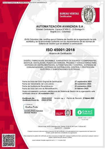 En este sentido y como herramienta de gran utilidad para asegurar este compromiso, Automatización Avanzada S.A desarrolló las acciones necesarias para lograr la certificación en la norma ISO 45001 otorgada el 26 de septiembre del año 2021 por Bureau Veritas..